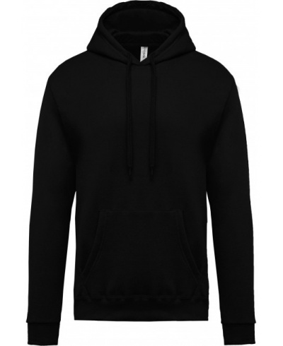 80 % cotton / 20 % polyester. Brushed fleece. Set-in sleeves. Tubular cut. Lined hood with matching drawstring. Kangaroo pockets. Ribbed cuffs and hem.