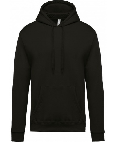 80 % cotton / 20 % polyester. Brushed fleece. Set-in sleeves. Tubular cut. Lined hood with matching drawstring. Kangaroo pockets. Ribbed cuffs and hem.