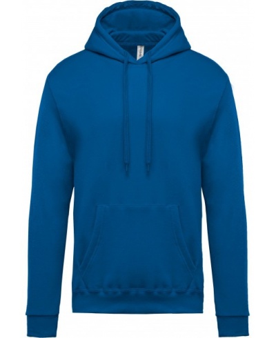 80 % cotton / 20 % polyester. Brushed fleece. Set-in sleeves. Tubular cut. Lined hood with matching drawstring. Kangaroo pockets. Ribbed cuffs and hem.