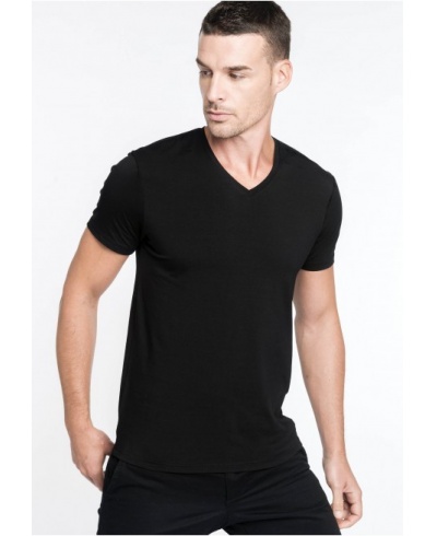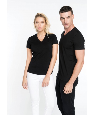 95% Cotton 5% Elastane. Slim fit. Self fabric V-neckline with reinforced tape. Twin needle finishing.