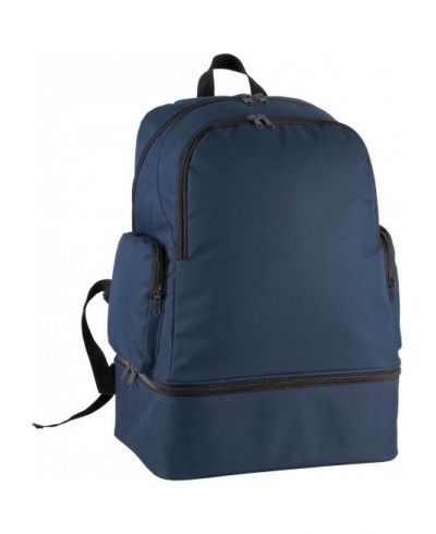 Team sports backpack in polyester 600D, double rubber feeling PVC backing. Detachable rigid bottom in PP plastic, with plastic feet. Zipped front pocket ideal for personalization, 2 side pockets, card holder. The rigid bottom comes with the backpack.