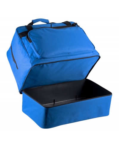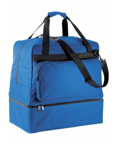 Team sports bag in polyester 600D, double rubber feeling PVC backing, 90 liters. Detachable rigid bottom in PP plastic, with plastic feet. Zipped front pocket ideal for personalization, card holder, detachable shoulder belt with silicon pad. The rigid bottom comes with the bag.