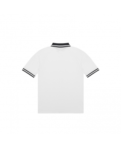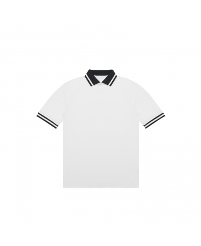 True gender-neutral style with side seams; breathable pinhole mesh fabric with silky handfeel; high quality collar with prominent contrast stripe; short single-button placket; side vents.