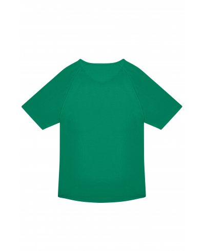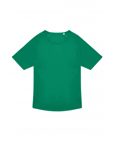 Breathability, inherent wicking (mesh); quick drying; raglan sleeves; side seams.