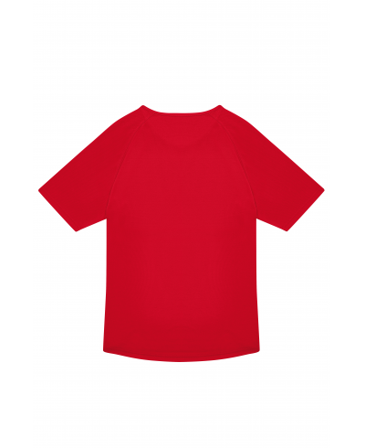 Breathability, inherent wicking (mesh); quick drying; raglan sleeves; side seams.