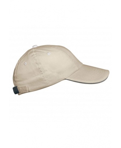 100 % Cotton Twill. Contrast sandwich peak. Size adjuster with metal buckle.