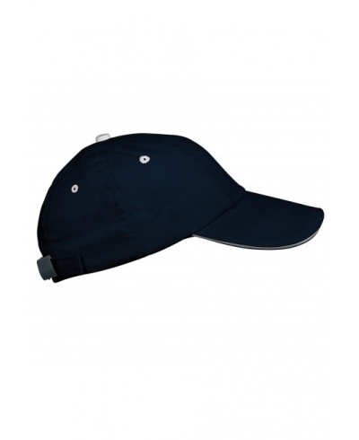 100 % Cotton Twill. Contrast sandwich peak. Size adjuster with metal buckle.