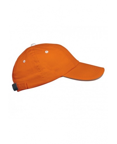 100 % Cotton Twill. Contrast sandwich peak. Size adjuster with metal buckle.