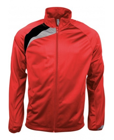 100% polyester tricot. Full length front zip. Contrast panels. 2 side pockets. Elasticated cuffs. Can be combined with PA100 to make a tracksuit.