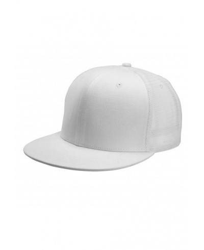 6 laminated cotton cap with mesh 100% polyester and flat peak. Cotton sweatband. Adjustable plastic closure.