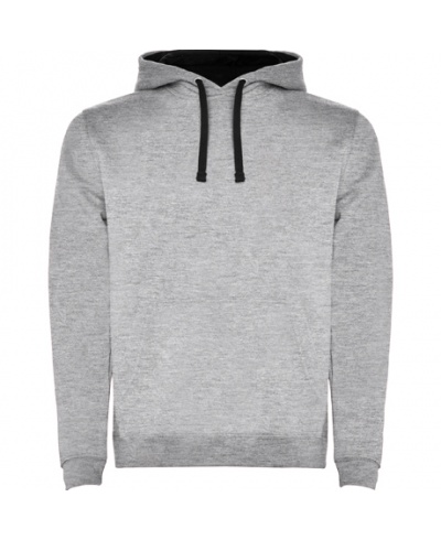 Two-coloured hoodie with double fabric, adjustable draw cord in contrast, reinforced covered seams in collar and kangaroo style pocket, 1x1 rib elastane in cuffs and waistband.