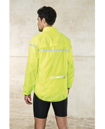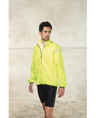 300T 100% polyester pongee. Water resistant up to 5000 mm. Breathable up to 2000 g/m2/24h. Full length front zip. Mesh vents at back. Large back pocket with reflective trim. Elasticated contrast binding at cuffs and hem. Reflective trims at back and sleeves.