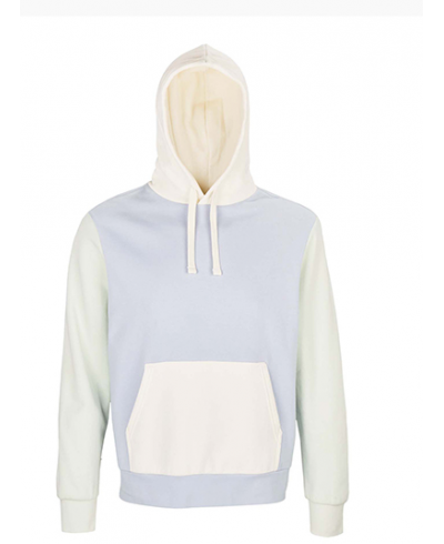 Material: Brushed fleece 280 - 80% combed organic cotton - In conversion 20% recycled polyester; Unisex, combed organic Cotton / recycled Polyester, tricolor, color-blocking, kangaroo pocket, lined hood with drawstring, ribbed collar, cuff and hem, half moon inside the collar, taped neck, brushed fleece, modern and comfortable cut; Certificates: GOTS - Global organic textile standard, STANDARD 100 by OEKO-TEX®