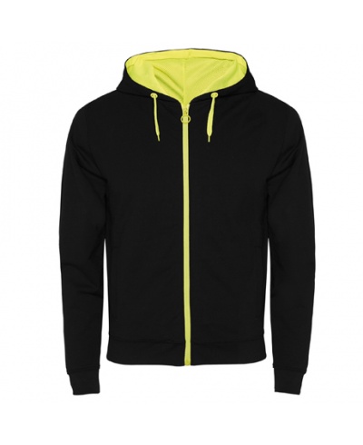 Non brushed fleece jacket with details in fluor colour. Central zip with puller to contrast. Hood with lining in microperforated polyester fabric in contrasting fluor colour and drawstring and contrasting metal eyelets in fluor colour. Long sleeves with cuff and waist rib 1x1. Two front pockets with wide trim. Reinforced covered seams in neck.