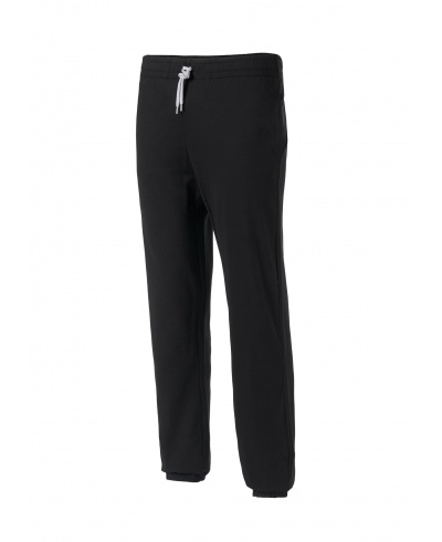 100% cotton. Supple and lightweight fabric. Elasticated waist with inner drawstring + interchangeable outer grey drawcord (colour drawcord sold separately under reference PA068). 2 side pockets and 1 back pocket. Elasticated bottoms.