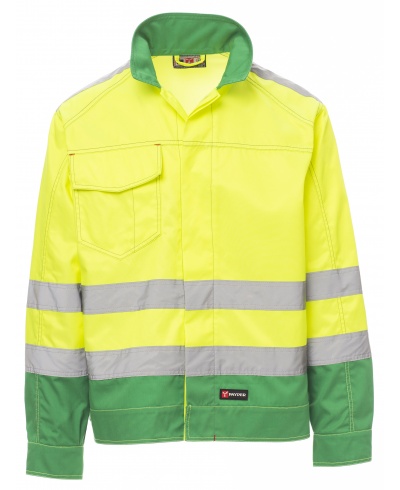 All season unisex lightweight high visibility jacket with reflective stripes, front fastening with plastic buttons and flap, cuff button fastening, adjustable hem with Velcro. Contrasting stitching, smartphone pocket, detachable badge holder and pen holder in the chest pocket with flap and Velcro, jeans-style fitted model
