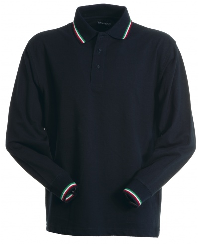 Unisex long-sleeved polo shirt with 3 matching buttons, collar and sleeve trim (colours of the flag), rib collar and cuffs, side vents, concealed collar stitching, side reinforcement tape, inner neck tape