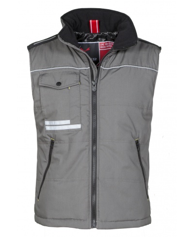 Unisex vest, 8 mm plastic zip with metal pull, contoured back, two roomy outer pockets with zip, roomy multi-function breast pocket, smartphone pocket and reflective stripes, badge holder ring. Padded, high-density lining, inner fleece collar, one pocket