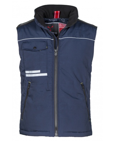 Unisex vest, 8 mm plastic zip with metal pull, contoured back, two roomy outer pockets with zip, roomy multi-function breast pocket, smartphone pocket and reflective stripes, badge holder ring. Padded, high-density lining, inner fleece collar, one pocket