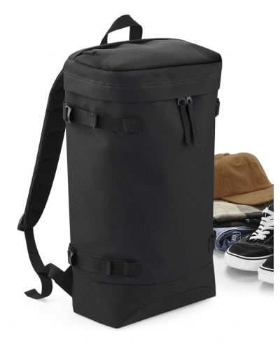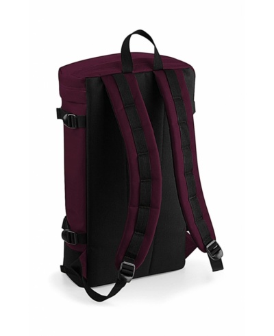TearAway label for ease of rebranding, heritage styling, laptop compatible up to 15.6", internal slip pocket, internal stash pocket, zippered top pocket, compression straps, padded back panel, padded adjustable shoulder straps, grab handle