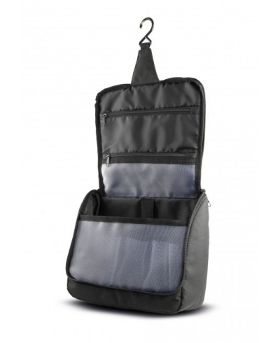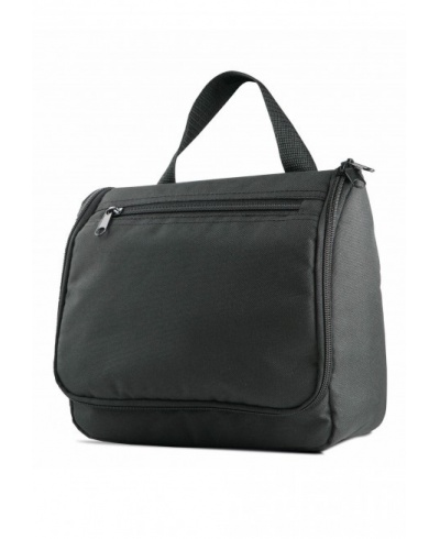 Vanity case in 600D, front flap opening, inner mesh pocket, mesh holders, hook hanger. SBS zip. Dimensions: 23 x 19 x 8 cm