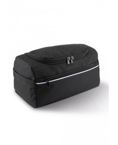 Vanity case in 600D PVC backing, hookable top flap, inner pocket, large front pocket, side handle. SBS zips.
