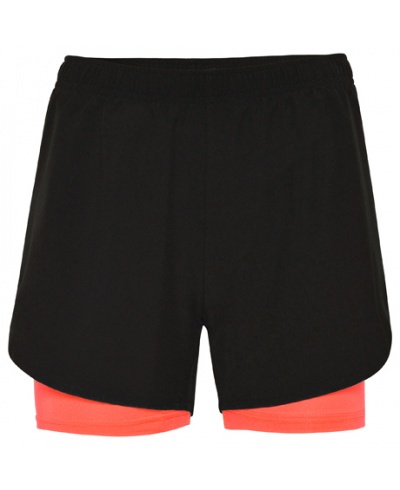 Woman´s sports shorts with contrasting short leggings inside. Elastic waistband with crossed inner drawcord for easy adjustment. Reflective detail. Body fitting and special elastic fabric for running.