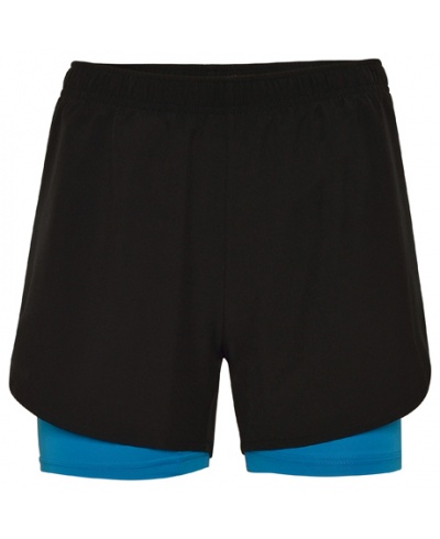 Woman´s sports shorts with contrasting short leggings inside. Elastic waistband with crossed inner drawcord for easy adjustment. Reflective detail. Body fitting and special elastic fabric for running.