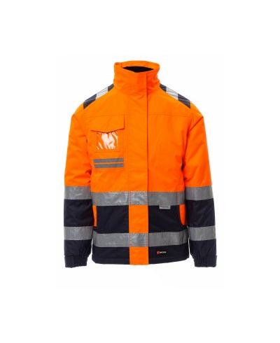 Women’s two-tone, high-visibility jacket with 3M stripes, plastic zip with metal pull with flap and Velcro, with foldaway hood, elasticated adjustable cuffs, two concealed front pockets, one breast pocket with badge holder, padded, fleece inside collar, inner pocket, heat taped seams