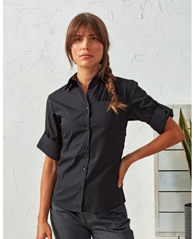 A popular style with bar staff who need to have their sleeves rolled up and fastened securely in place. Initially a long sleeve blouse, the sleeve can be rolled up and fastened with a tab and button on the upper arm.