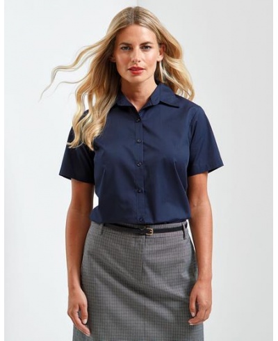 A women's short sleeve blouse with semi-fitted styling, available in 27 colours. The blouse features soft collar styling with bust and back darts and a rounded bottom hem for a really attractive piece of workwear.