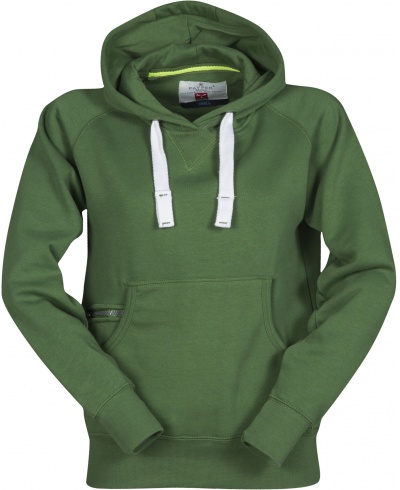 Women’s fitted hoodie with double stitched seams and white drawstring with contrasting stitching and metal rings, raglan sleeves, V-design neck stitching, kangaroo pockets, small zip pocket, stretch rib cuffs and hem, reinforced seams