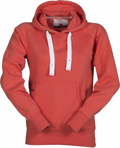 Women’s fitted hoodie with double stitched seams and white drawstring with contrasting stitching and metal rings, raglan sleeves, V-design neck stitching, kangaroo pockets, small zip pocket, stretch rib cuffs and hem, reinforced seams