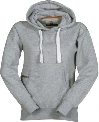 Women’s fitted hoodie with double stitched seams and white drawstring with contrasting stitching and metal rings, raglan sleeves, V-design neck stitching, kangaroo pockets, small zip pocket, stretch rib cuffs and hem, reinforced seams