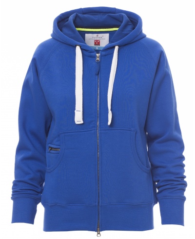 Women’s fitted hoodie with full, plastic-covered SBS zip with double metal pull, hood with double stitched seams and white drawstring with contrasting stitching and metal rings, raglan sleeves, kangaroo pockets, small zip pocket, stretch rib cuffs and hem, reinforced seams