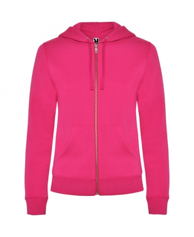 Woman´s hoodie with hood lined to tone. Front metal zip and kangaroo pocket. Reinforced covered seams in collar. 2x2 rib knit in cuffs and waist. Fitted cut.