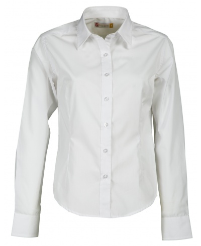 Women’s fine weave combed cotton fitted shirt, pleats at the front and back, Italian-style collar, tailored cuff with 2 buttons and button hole, stitched placket with matching buttons, with yoke