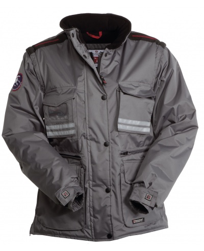 Women’s comfort-fit jacket with detachable sleeves, 8 mm plastic zip with metal pull, with flap fastening and plastic buttons, detachable and/or foldaway shaped hood, adjustable cuffs, grey reflective stripes on the front and back, pre-shaped elbows and side vent with gusset and zip, nine outer pockets, two with LOCK SYSTEM, two with zip and reinforced inner, one with a reversible badge holder. Padded, micro-fleece inside collar, back and lower back warmer, breathable underarm inserts, inner drawstring and zip for easier printing and embroidery