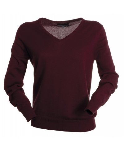 Women’s V neck jumper with fine rib collar, cuffs and hem, in stocking stitch and fully fashioned without seams.