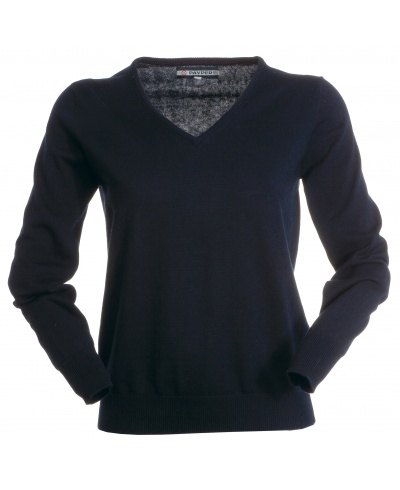 Women’s V neck jumper with fine rib collar, cuffs and hem, in stocking stitch and fully fashioned without seams.