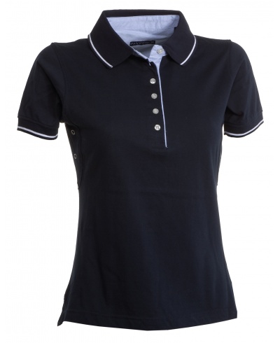 Women’s short-sleeved fitted polo shirt with 6 white buttons, inside collar, flap and side vents in Oxford blue, rib collar and sleeve edging with fine contrasting trim, underarm eyelets, side vents with