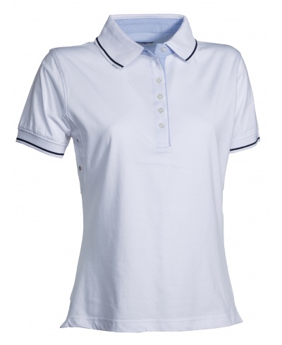 Women’s short-sleeved fitted polo shirt with 6 white buttons, inside collar, flap and side vents in Oxford blue, rib collar and sleeve edging with fine contrasting trim, underarm eyelets, side vents with