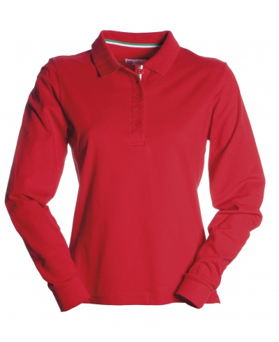 Women’s long-sleeved fitted polo shirt with 5, matching, mother-of-pearl effect buttons, matching collar, with contrasting underside (colours of the flag). Inner button flap and side vents with colours of the flag, rib collar and cuffs, concealed collar stitching, side reinforcement tape