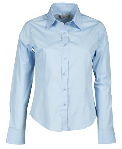 Women's fine weave combed cotton fitted shirt, pleats at the front and back, Italian-style collar, tailored cuff with 2 buttons and button hole, stitched placket with matching buttons. With yoke. Easy-care fabric