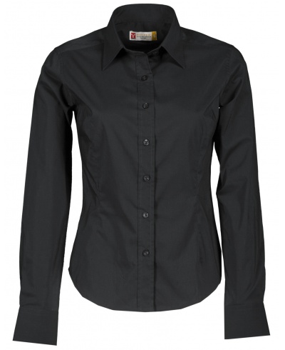 Women's fine weave combed cotton fitted shirt, pleats at the front and back, Italian-style collar, tailored cuff with 2 buttons and button hole, stitched placket with matching buttons. With yoke. Easy-care fabric