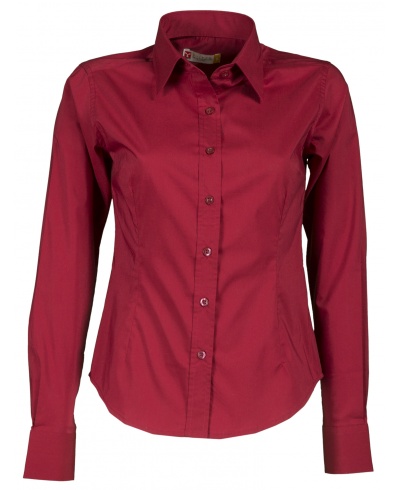 Women's fine weave combed cotton fitted shirt, pleats at the front and back, Italian-style collar, tailored cuff with 2 buttons and button hole, stitched placket with matching buttons. With yoke. Easy-care fabric