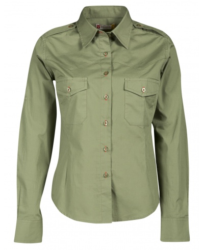 Women’s fine weave combed shirt, slightly tailored, pleats at the front and back, Italian-style collar, tailored cuff with 2 buttons and button hole, stitched placket with matching buttons and red buttonholes (apart from the white version), shaped yoke at the front (apart from the white version), shoulder tabs, two breast pockets with flap, roll up sleeves with button and tab