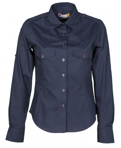 Women’s fine weave combed shirt, slightly tailored, pleats at the front and back, Italian-style collar, tailored cuff with 2 buttons and button hole, stitched placket with matching buttons and red buttonholes (apart from the white version), shaped yoke at the front (apart from the white version), shoulder tabs, two breast pockets with flap, roll up sleeves with button and tab