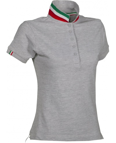 Women’s short-sleeved fitted polo shirt with 5, matching, mother-of-pearl effect buttons, matching collar with contrasting underside (colours of the flag). Right sleeve edging with colour trim (same colour as collar), rib collar and sleeve edging, side vent trim with colours of the flag, concealed collar stitching with jersey tape (colours of the flag), side reinforcement tape, inner neck tape