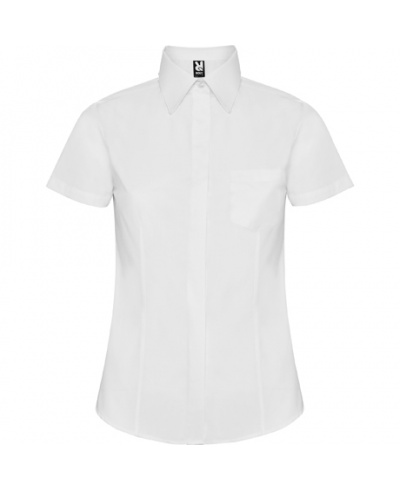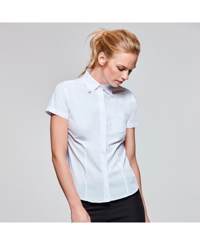 Slim fitted shirt with front and back darts, left front pocket and covered flap buttons. Curved hem. Easy care.